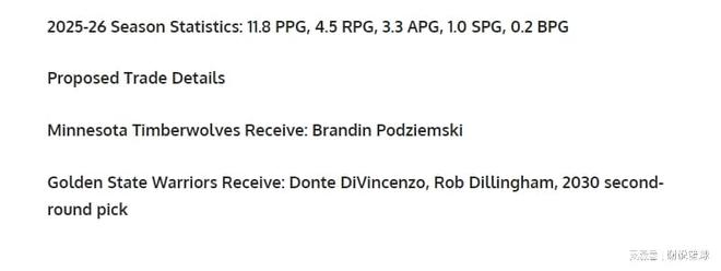 距離本賽季交易截止日,現(xiàn)在只有不到一個月時間了,所以各類流言可謂滿天飛,更何況勇士這種流量大隊。因此媒體FW也來湊熱鬧,支招勇士做1換3交易,送走替補(bǔ)布蘭丁-波杰姆斯基,換回后衛(wèi)唐特-迪文琴佐,方案涉及的其他部分,是前樂透秀迪林厄姆再加上一個來自2030年次輪簽當(dāng)添頭。