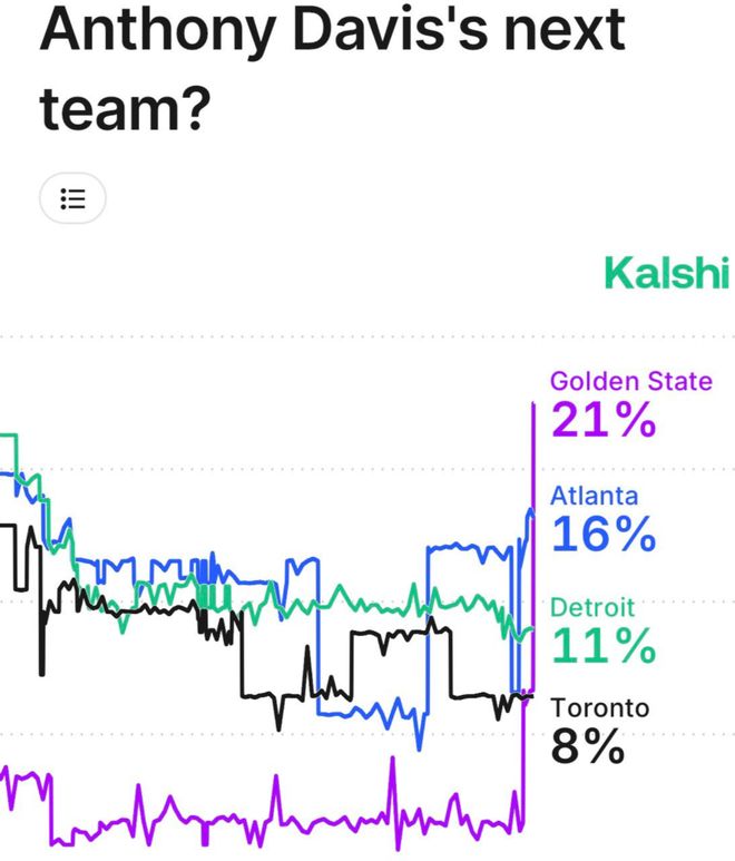 目前著名模型公司Kalshai做出交易模型,認(rèn)為勇士目前有21%概率得到濃眉,從概率上領(lǐng)跑全聯(lián)盟。
