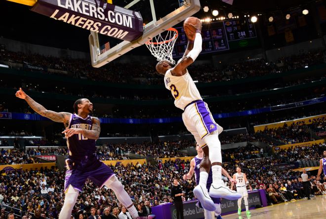 末節(jié)老詹先帶著四個(gè)替補(bǔ)打,老詹助攻阿彪暴扣,下一次擊地傳球被施羅德?lián)寯?,老詹持球突破完?+1完成20+的數(shù)據(jù),國(guó)王縮小到20分雷迪克暫停。詹姆斯突破明顯被犯規(guī)但沒有吹,他回過來(lái)暴扣釋放,最后4分鐘44秒國(guó)王放棄比賽了。