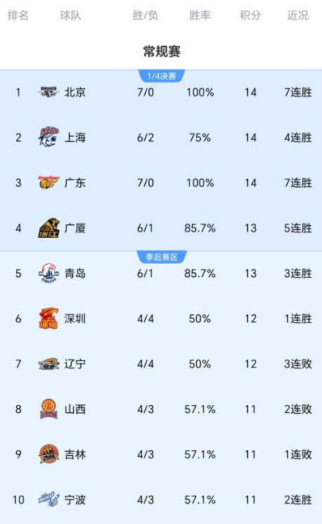 最新積分榜排名,深圳隊(duì)反超遼寧隊(duì),升至第六位。