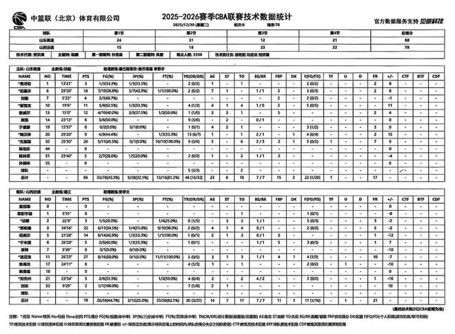 北京時間2025年12月30日19:35,2025-2026賽季CBA聯(lián)賽第八輪繼續(xù)進行,山西汾酒赴客場挑戰(zhàn)山東高速。兩隊歷史上共交手40次,山西汾酒14勝26負,上賽季常規(guī)賽兩隊交手2次,山西汾酒2勝0負。本場比賽,山西隊狀態(tài)低迷,特別是上半場,進攻猶豫、防守松懈,籃板球保護不佳;中場調(diào)整后雖有所改善,但由于此前落后過多,最終無力翻盤,全場比賽結(jié)束,山西汾酒78:88不敵山東高速。