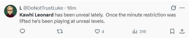 美球迷:自從萊昂納德解除了登場時間限制后,他的表現(xiàn)就超乎尋常了。