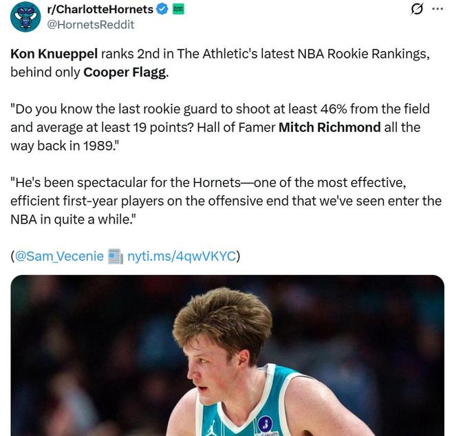 在NBA最新公布的最佳新秀榜單中同樣如此,弗拉格繼續(xù)高居第一,克努佩爾緊隨其后位列第二。