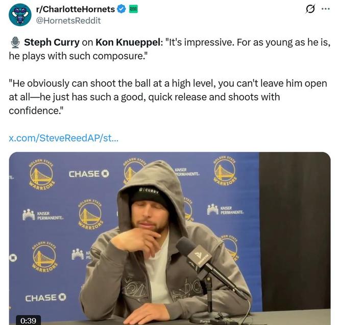 面對克努佩爾這樣的表現(xiàn),勇士隊將帥科爾與庫里先后在賽后公開點名稱贊這名年僅20歲的新秀。