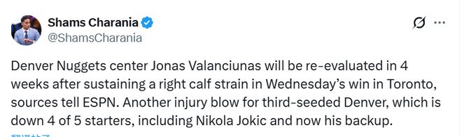 北京時(shí)間1月2日,名記Shams報(bào)道,據(jù)ESPN消息人士透露,丹佛掘金隊(duì)中鋒瓦蘭丘納斯在周四客場(chǎng)對(duì)陣猛龍隊(duì)的比賽中右小腿拉傷,將在4周后接受復(fù)查。這對(duì)排名第三的掘金隊(duì)來說無疑是又一次傷病打擊,目前球隊(duì)五名首發(fā)球員中已有四人缺陣,約基奇和他的替補(bǔ)瓦蘭丘納斯都受傷了。