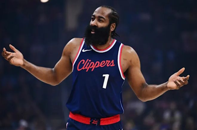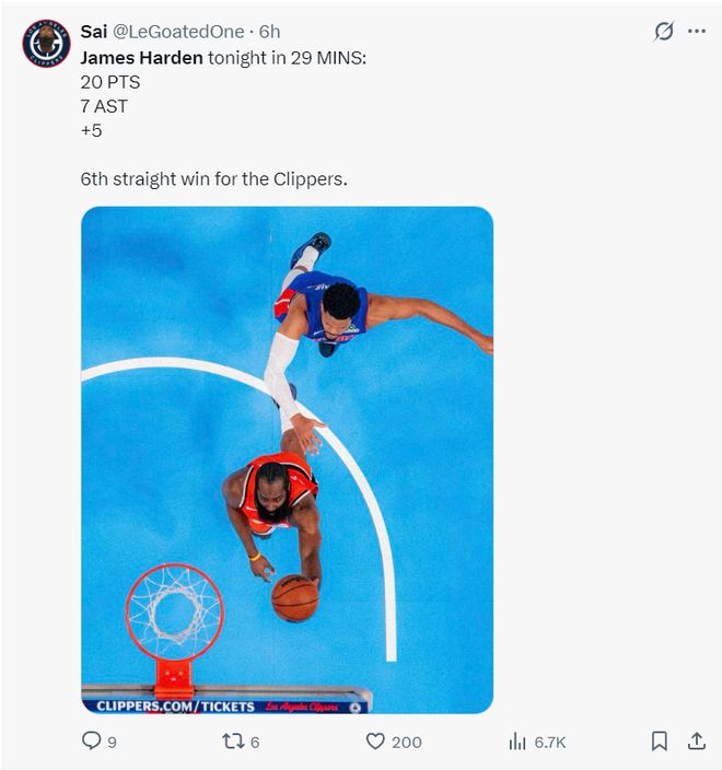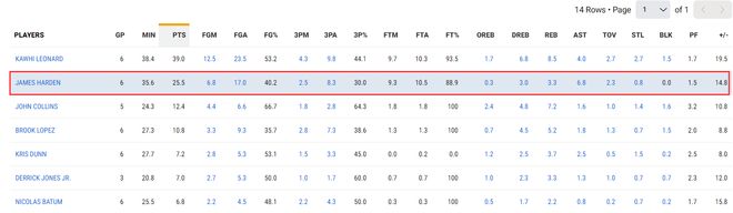 哈登全場比賽28分53秒,14中5,三分6中1,罰球11中9,拿到20分7助攻3籃板1失誤,命中率35.7%,三分命中率17.6%,真實命中率53.1%,正負值+5。雖然效率不佳但他在場對快船是正效率,可末節(jié)哈登被DNP了。