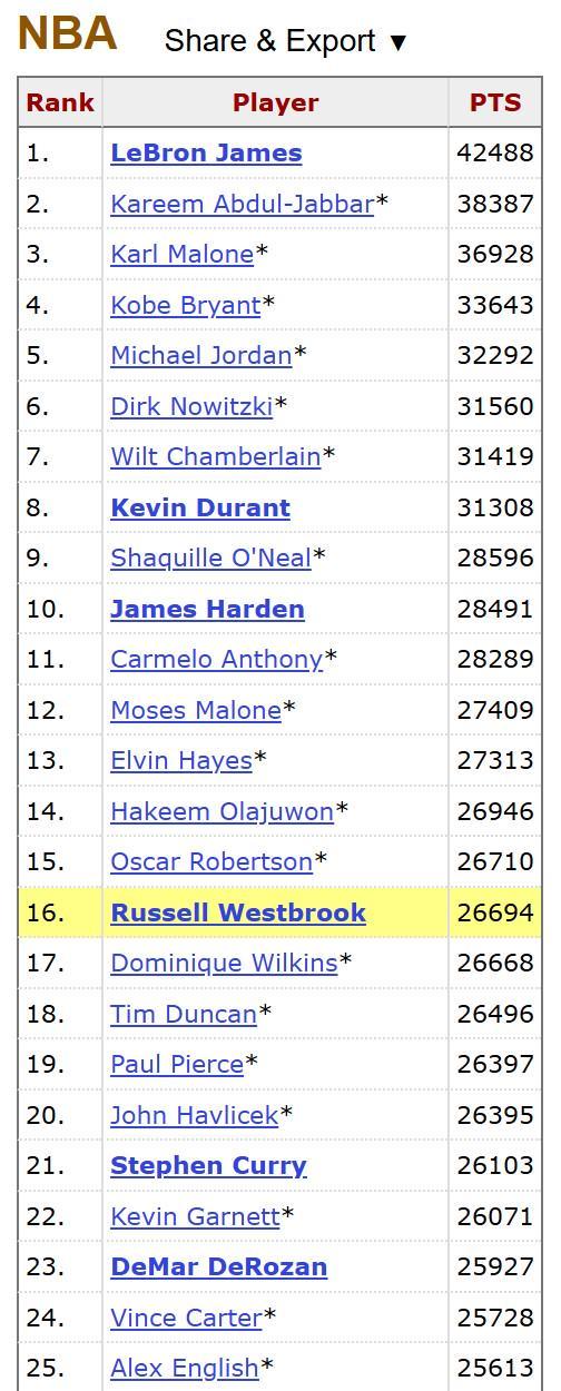 在本場比賽之前,威少總得分為26694分,距離前一位的“大O”奧斯卡-羅伯特森相差16分。此役過后,威少完成了對羅伯特森的超越,升至歷史總得分榜第15位,他也成為NBA歷史上得分最多的后衛(wèi)球員。目前排在第14位的是“大夢”奧拉朱旺,威少距離前者還有235分的差距,本賽季完成超越指日可待。
