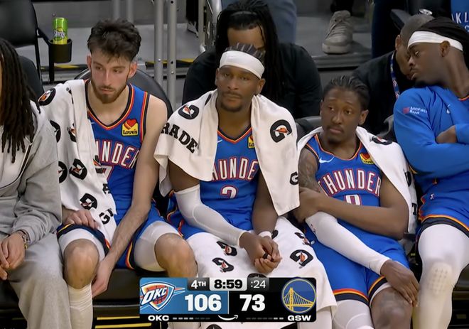 其實(shí)本場(chǎng)比賽從過(guò)程到結(jié)果,都沒有太多懸念,勇士輸?shù)袅怂麄兦槔碇械囊粓?chǎng)比賽,雷霆不可阻擋,亞歷山大延續(xù)20+紀(jì)錄。而透過(guò)本場(chǎng)比賽,有幾件事能反應(yīng)勇士當(dāng)下隊(duì)內(nèi)狀態(tài)。第一,就是庫(kù)明加拒絕背鍋出戰(zhàn)。正常比賽科爾不讓庫(kù)明加打,輪到這種必輸?shù)木?,派上?kù)明加,純屬膈應(yīng)人。庫(kù)明加也不傻,最快2周就能離開勇士,何必還在這繼續(xù)付出呢。勇士?jī)?nèi)部一定是存在一些分歧的,尤其是在前段時(shí)間,從巴特勒到格林,包括庫(kù)里都在聲援庫(kù)明加,只不過(guò)無(wú)法改變庫(kù)明加被交易的結(jié)局。