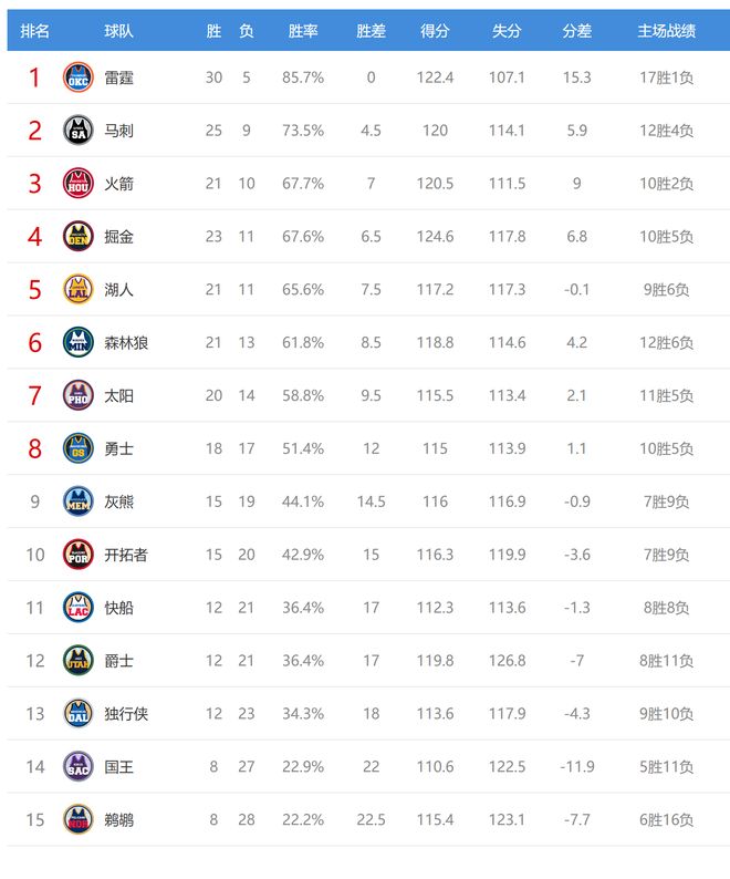 今日比賽后火箭、掘金排名互換,其他西部球隊排名不變。