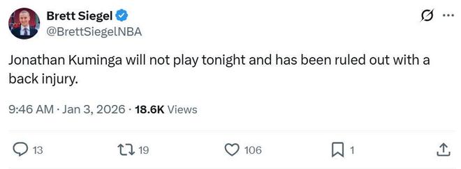 本場(chǎng)比賽庫明加又鬧出幺蛾子,在比賽即將開打之際,勇士隊(duì)官方突然宣布庫明加因?yàn)橄卤巢克嵬慈毕荣悺?/p>