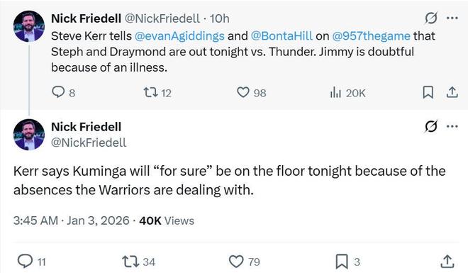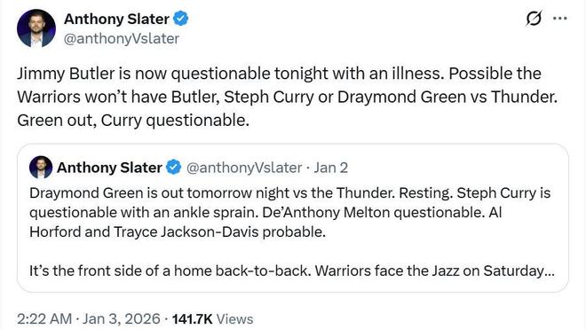 根據(jù)ESPN的報(bào)道,因?yàn)楸緢?chǎng)是一場(chǎng)全美直播的比賽,庫里、巴特勒、追夢(mèng)又符合聯(lián)盟對(duì)于“明星球員”的定義,因此勇士隊(duì)本場(chǎng)一口氣突然輪休3大核心將被調(diào)查。