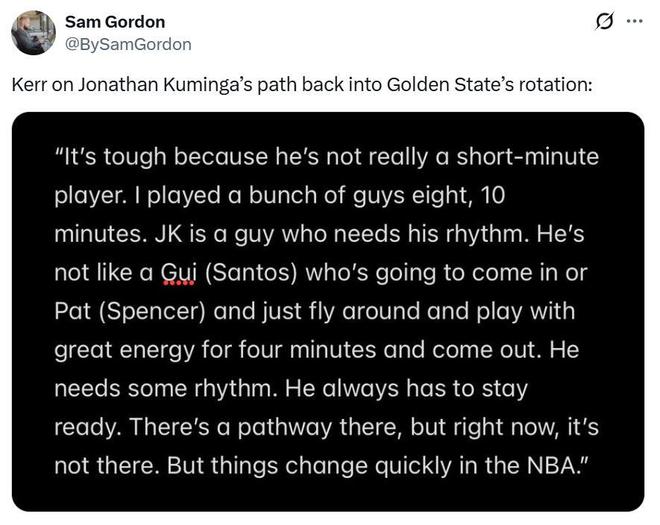 結(jié)果庫明加用行動(dòng)打臉科爾,其實(shí)也難怪庫明加不滿科爾與勇士隊(duì),在本場(chǎng)比賽之前,庫明加已經(jīng)連續(xù)被DNP了6場(chǎng)比賽,哪怕是垃圾時(shí)間庫明加也撈不到登場(chǎng)機(jī)會(huì)。