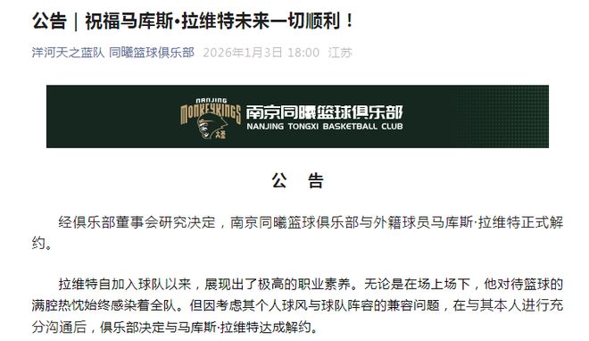 經(jīng)俱樂(lè)部董事會(huì)研究決定,南京同曦籃球俱樂(lè)部與外籍球員馬庫(kù)斯·拉維特正式解約。