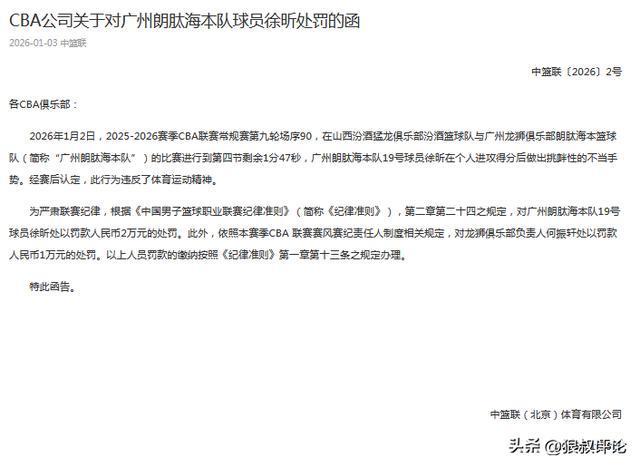 北京時間1月3日,CBA官方公示罰單,廣州客場擊敗山西的比賽當中,徐昕在個人進攻得分后做出挑釁性的不當手勢。經(jīng)賽后認定,此行為違反了體育運動精神, 處以罰款人民幣2萬元的處罰。