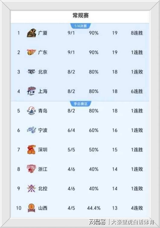 ①、獲勝的廣廈男籃和廣東隊(duì)以9勝1負(fù)的戰(zhàn)績高居前二位;