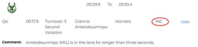 唯一一次漏判發(fā)生在距離比賽結(jié)束還有17.9秒,報告指出,字母哥在對方禁區(qū)停留時間超過3秒,這是一次漏吹的3秒違例。雄鹿獲利,黃蜂吃虧。