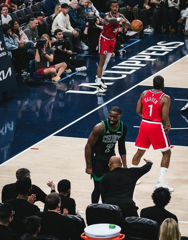 比賽開始凱爾特人獲得首次進(jìn)攻,懷特外線大空位三分手起刀落,攻防轉(zhuǎn)換杰倫布朗直接對位小卡,大洛、懷特三分各自打鐵,倫納德持球過來三分線外直接干拔穩(wěn)穩(wěn)命中,杰倫布朗過來中距離干拔第一次出手也有,快船失誤,豪澤底線三分空位機(jī)會(huì)把握住,科林斯內(nèi)線吃餅5-8開局。杰倫布朗分球內(nèi)線給內(nèi)線科塔同樣吃餅,科林斯內(nèi)線繼續(xù)有吃餅機(jī)會(huì),懷特三分追身投一個(gè)沒有,回過來防守端被小卡造成犯規(guī),倫納德單打布朗沒有,轉(zhuǎn)換回來布朗連得4分凱爾特人14-9領(lǐng)先5分,7分41秒哈登受傷倒地泰倫盧叫停比賽!回到比賽大洛三分不中,回過來豪澤到內(nèi)線后仰跳投得分,開局這段時(shí)間凱爾特人命中率很高,哈登三分不中,轉(zhuǎn)換過來懷特三分還有19-9快船落后10分了!科林斯突破上籃幫助快船稍稍止血,倫納德、科林斯內(nèi)線連續(xù)上分15-22分差回到7分,凱爾特人暫停!