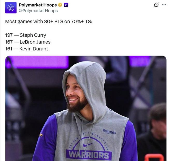 憑借這樣的表現(xiàn),庫里不僅打破這一項紀錄,也是其生涯第197場以70%+真實命中率轟下30+得分表現(xiàn),同樣是斷檔歷史第一,詹姆斯167次排在第二,杜蘭特161次第三。