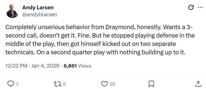 面對追夢這樣的表現(xiàn),爵士記者Andy Larsen公開發(fā)文批評道:“追夢的行為完全不負責(zé)任,實話實說,他想得到一個三秒違例的判罰,但沒有得到,結(jié)果他就在比賽進行的情況下,直接放棄防守怒噴裁判,然后直接被罰出場,這一幕發(fā)生在第二節(jié),還是在此前沒有任何鋪墊的情況下?!?/p>