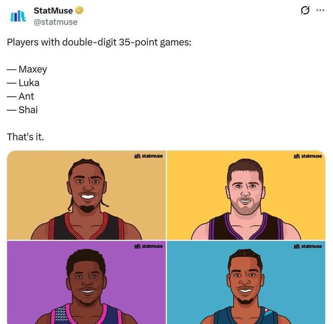 這是本賽季馬克西第11次單場轟下35+表現(xiàn)聯(lián)盟第二,僅次于東契奇的12次,亞歷山大與愛德華茲10次并列第三。