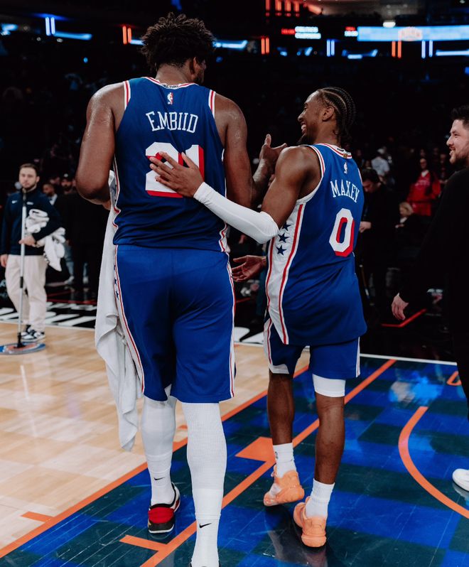 此役他與埃奇庫姆成為費城隊史首對拿到25+4三分+2蓋帽的組合。