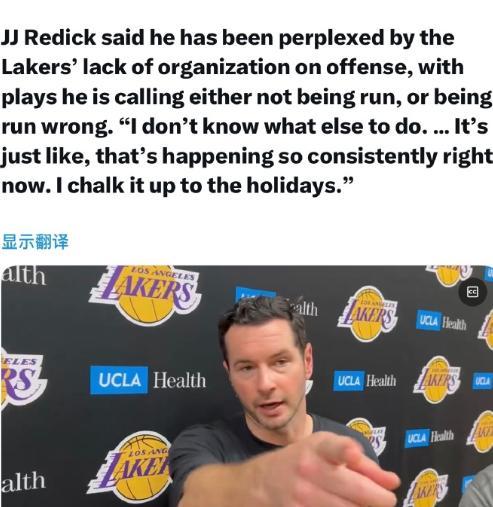 1月4日,湖人主教練雷迪克在接受采訪時(shí),不滿球隊(duì)打球混亂,進(jìn)攻端毫無組織性,自己安排的戰(zhàn)術(shù)沒人執(zhí)行!