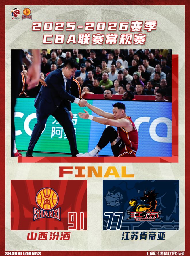 北京時(shí)間2026年1月4日19:35,2025-2026賽季CBA聯(lián)賽第十輪繼續(xù)進(jìn)行,山西汾酒主場(chǎng)對(duì)陣江蘇肯帝亞。兩隊(duì)歷史上共交手39次,山西汾酒23勝16負(fù),上賽季常規(guī)賽兩隊(duì)交手2次,山西汾酒2勝0負(fù)。本場(chǎng)比賽,山西隊(duì)雖然一直保持領(lǐng)先,但在籃板球的拼搶和保護(hù)上依舊存在問題,仍需賽后進(jìn)一步總結(jié),最終全場(chǎng)比賽結(jié)束,山西汾酒91:77戰(zhàn)勝江蘇肯帝亞。