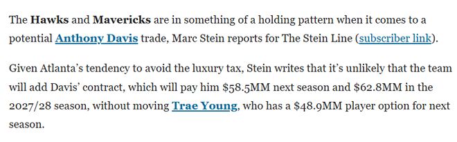 斯坦因?qū)懙溃b于老鷹隊(duì)向來有規(guī)避奢侈稅的傾向,若不將特雷-楊納入交易籌碼,他們基本不可能接手戴維斯的合同——戴維斯下賽季薪資為5850萬美元,2027-28賽季則為6280萬美元,而特雷-楊下賽季擁有4890萬美元的球員選項(xiàng)。