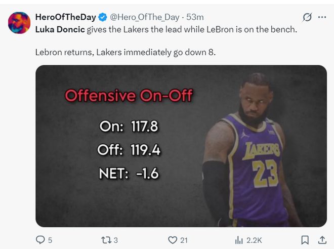 首節(jié)打完,HOTD寫道:東契奇帶隊是領(lǐng)先灰熊的,這時候詹姆斯坐在板凳上,可詹姆斯一登場湖人就落后到8分,詹姆斯登場湖人進攻效率117.8,詹姆斯下場湖人進攻效率119.4。