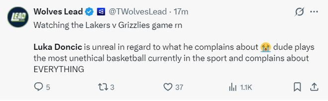 但森林狼的媒體卻覺得詹黑媒體在胡扯,他寫道:我正在看湖人VS灰熊的比賽,東契奇對著裁判各種抱怨自己被犯規(guī),這位運動員打球的手段實在是太不道德了,他對所有事都喋喋不休。