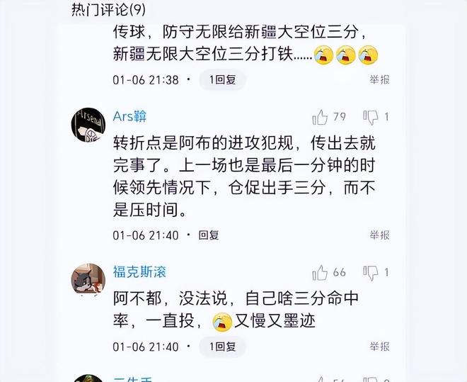 球迷說,“看到沙拉木投三分就緊張”、“這場隊長確實打的不好,但凡進(jìn)一個三分都不一樣”、“阿不都沙拉木,沒法說,自己啥三分命中率,一直投,又慢又墨跡”、“這場沙拉木打的垃圾,特么莫名其妙的失誤,投三分啥玩意亂七八糟”,球迷嘆息:沙拉木打的一坨屎!