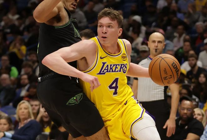 本場(chǎng)比賽中,湖人的替補(bǔ)側(cè)翼新星道爾頓-克內(nèi)克特(Dalton Knecht)非常罕見(jiàn)地在比賽常規(guī)階段起到了一些作用??藘?nèi)克特全場(chǎng)出場(chǎng)10分56秒,投籃5中2,三分線外4中2,得到了6分,還有2次犯規(guī),正負(fù)值為+5。大家都知道,克內(nèi)克特在其他方面的能力非常有限,沒(méi)有基本的傳球視野,沒(méi)有出色的防守能力,在其他方面都實(shí)在是沒(méi)有辦法為球隊(duì)提供任何的幫助和支持,但至少在本場(chǎng)比賽中,他還是命中了兩記三分,在有限的出場(chǎng)時(shí)間內(nèi)在進(jìn)攻端為球隊(duì)提供了一定的幫助和支持??藘?nèi)克特在本場(chǎng)比賽中也算是完成了自己應(yīng)該完成的任務(wù),在場(chǎng)上起到了自己的作用,并且為球隊(duì)的勝利做出了不小的貢獻(xiàn),至少他也是沒(méi)有拖球隊(duì)后腿了。