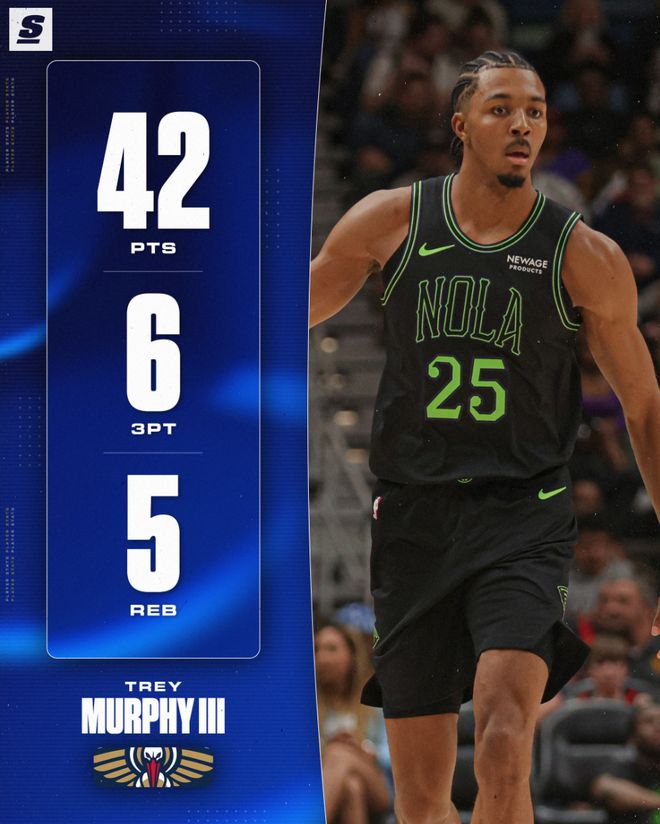 在這個(gè)消息出爐后,墨菲在對(duì)陣湖人的比賽中就大放異彩,全場(chǎng)比賽39分鐘,26中14,三分17中6,罰球9中8,拿到42分5籃板3助攻,命中率53.8%,三分命中率35.3%,他的個(gè)人表現(xiàn)比東契奇還要出色。