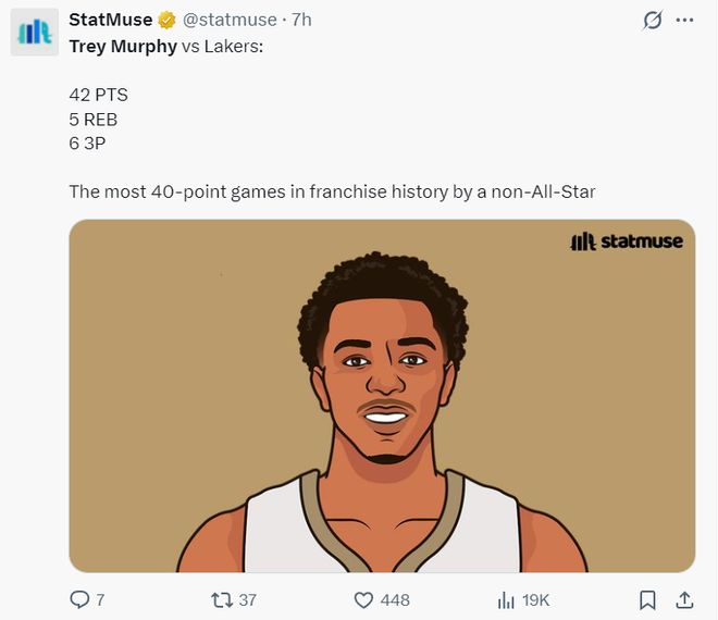 7.墨菲在這場(chǎng)比賽中達(dá)成了生涯700三分里程碑。