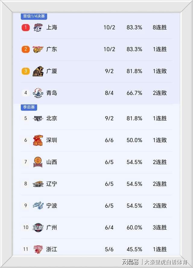①、先賽一場的上海隊以10勝2負(fù)戰(zhàn)績超過廣廈,重登榜首寶座;