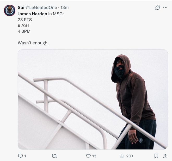 末節(jié),哈登、小卡兩個核心一同啞火了,兩人合計是7中1,只有哈登命中了一個運動戰(zhàn)進球,末節(jié)兩人合計只有2分,哈登的命中率還更低一些,最終尼克斯完成了大逆轉(zhuǎn),哈登這場比賽肯定又要背鍋了。
