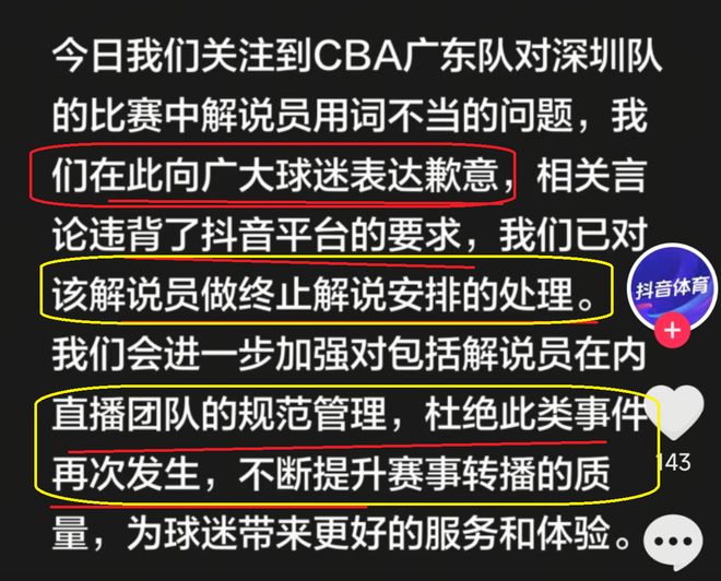 于是,也是有很多廣東隊球迷進行投訴,結果,大家也是看到了,抖音平臺在第一時間,對該解說員進行處理,終止了他解說員的資格。與此同時,抖音平臺還向廣大的球迷進行了道歉。