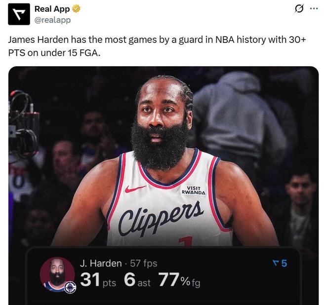 憑借這樣的表現(xiàn),哈登生涯已經(jīng)第19次在出手少于15次的情況下,單場轟下30+得分表現(xiàn),高居NBA歷史后衛(wèi)第一。
