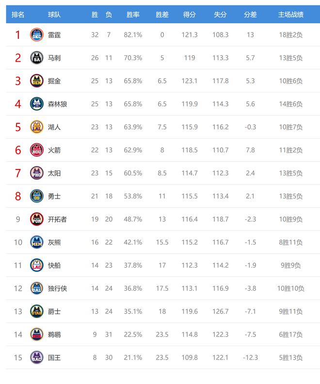 今日比賽后快船、獨(dú)行俠排名互換,鵜鶘、國王排名互換,其他西部球隊排名不變。