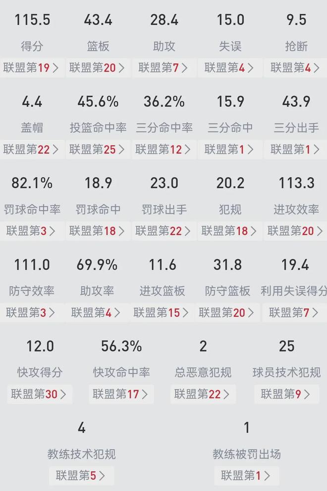 目前為止,勇士以21勝18負(fù)排在西部第八,場(chǎng)均得分115.5聯(lián)盟第19,進(jìn)攻效率113.3第20,場(chǎng)均三分出手(43.9)和命中數(shù)(15.9)均高居榜首,防守效率111.0第三,籃板43.4第20等等。