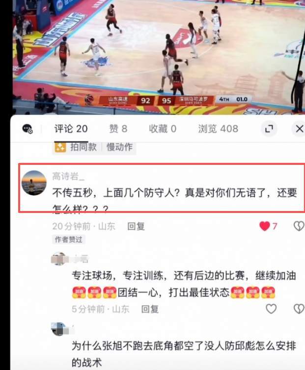 更叫人感到無(wú)法理解的是,外界瘋狂吐槽高詩(shī)巖之際,這小伙子夾起尾巴來(lái)就好了,不吭聲,過(guò)兩天這事兒就過(guò)去了,他倒好,還很不服氣,居然跑去評(píng)論區(qū)教育起來(lái)球迷了,他寫(xiě)道:“不傳五秒?上面幾個(gè)防守人?真是對(duì)你們無(wú)語(yǔ)了,還要怎么樣?”