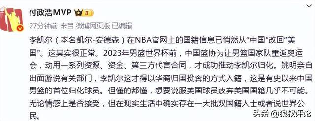 北京時間12月24日,根據(jù)NBA官方的公示,中國男籃歷史上首位歸化球員李凱爾,目前已經(jīng)更改為美國國籍,這就意味著他和中國男籃的合作正式告一段落。