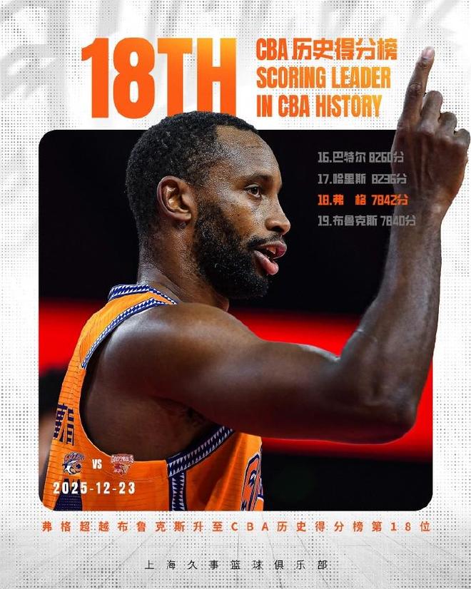此役過后,弗格在CBA生涯的總得分來到了7842分,超越廣東功勛外援馬尚-布魯克斯,升至歷史第18位。在他身前的是四川隊冠軍外援麥克-哈里斯,后者還領先弗格394分。