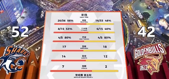 半場數(shù)據(jù)統(tǒng)計方面,李弘權(quán)半場三分5中4砍下18分,大鯊魚全隊三分15中8命中率超50%的同時完成7次搶斷和2次封蓋,造成對手出現(xiàn)10次失誤。