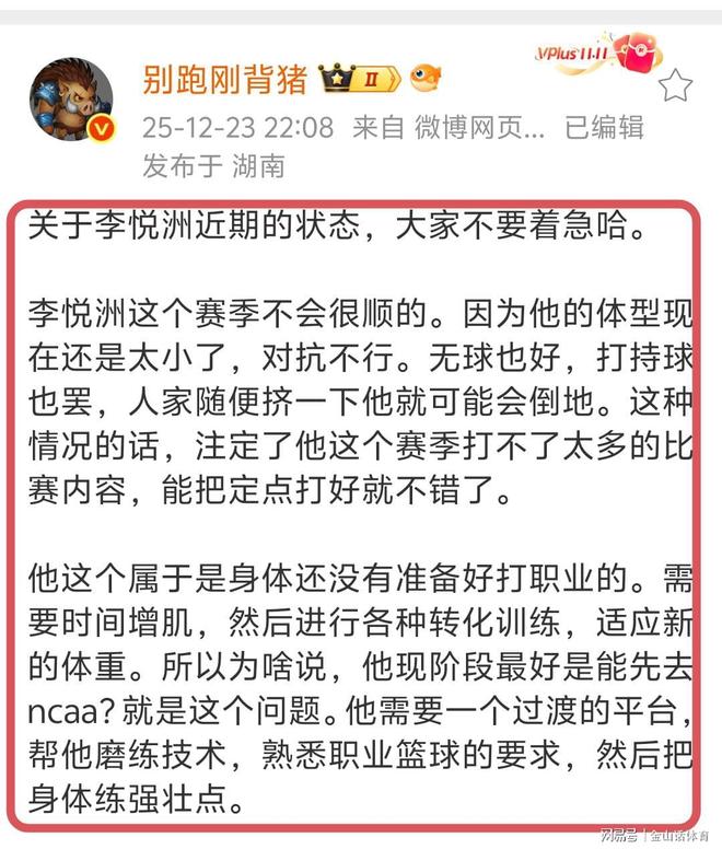 “他這個(gè)屬于是身體還沒(méi)有準(zhǔn)備好打職業(yè)的。需要時(shí)間增肌,然后進(jìn)行各種轉(zhuǎn)化訓(xùn)練,適應(yīng)新的體重。所以為啥說(shuō),他現(xiàn)階段最好是能先去ncaa?就是這個(gè)問(wèn)題。他需要一個(gè)過(guò)渡的平臺(tái),幫他磨練技術(shù),熟悉職業(yè)籃球的要求,然后把身體練強(qiáng)壯點(diǎn)?!?,這位媒體人的點(diǎn)評(píng),非常中肯。