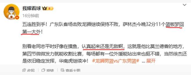 而另一位媒體人則表示,別看他老了,認(rèn)真起來仍然是無敵,他原話是,"五連勝到手!廣東隊(duì)客場擊敗龍獅繼續(xù)保持不敗,薩林杰今晚32分11個籃板夢回第一大外!別看老同志平時好像在摸魚,認(rèn)真起來還是無敵啊,這就是他比莫蘭德香的地方,第四節(jié)微微發(fā)力就能收割比賽。”杜鋒真是沒有看錯人,他也回報了杜鋒。
