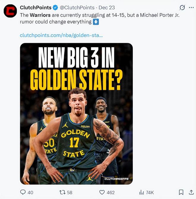 北京時間12月24日,Clutchpoints記者Brett Siegel關(guān)注交易流言的長文中提到,自12月以來金州勇士隊(duì)成為交易市場上最活躍的球隊(duì),他們已經(jīng)跟公牛、籃網(wǎng)、鵜鶘等多支球隊(duì)商議過交易方案。