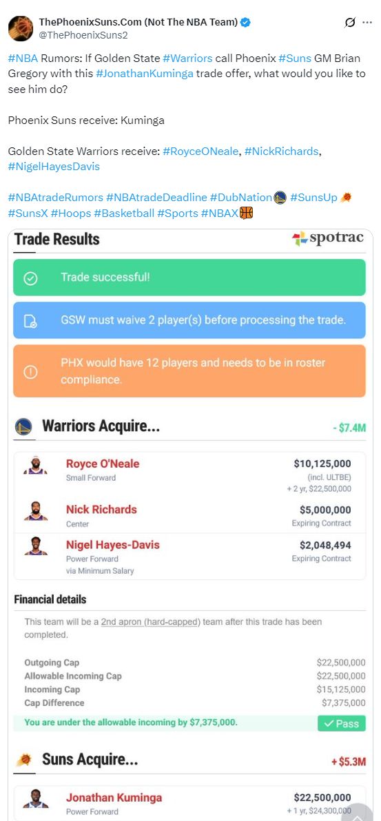 太陽媒體非常喜歡庫明加,他們甚至愿意用小奧尼爾、理查茲、海耶斯-戴維斯來交易得到庫明加,但庫明加要在1月16日后才能被交易。
