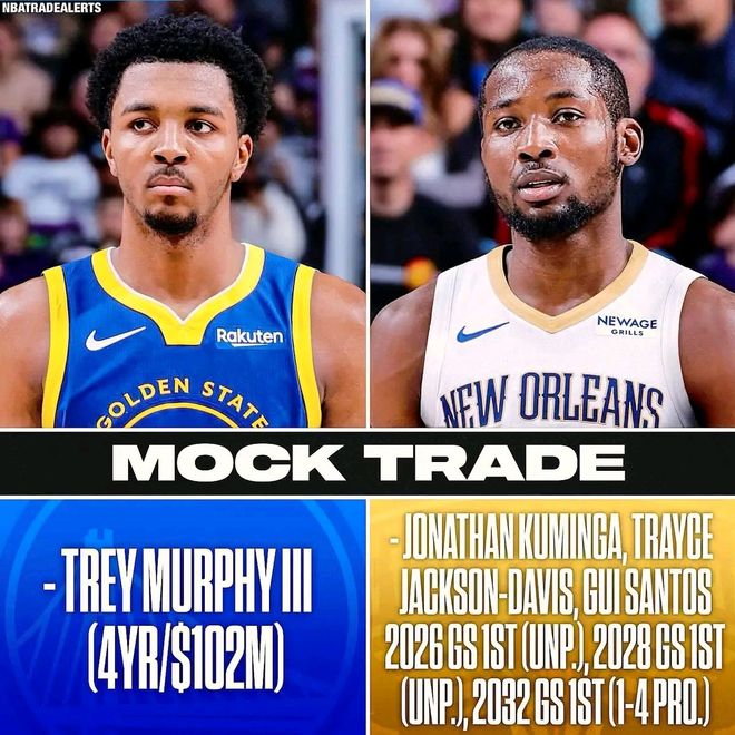 勇士隊(duì)與墨菲的交易流言已經(jīng)盛行了數(shù)周,而且勇士隊(duì)也已經(jīng)跟鵜鶘隊(duì)商議過交易方案,此前美媒也模擬過兩隊(duì)的交易方案,勇士送出庫明加、戴維斯、桑托斯、2026年首輪交換權(quán)、2028年首輪交換權(quán)、2032年首輪1-4順位保護(hù)得到墨菲,墨菲本賽季是一位場均21+6的頂級3D側(cè)翼。