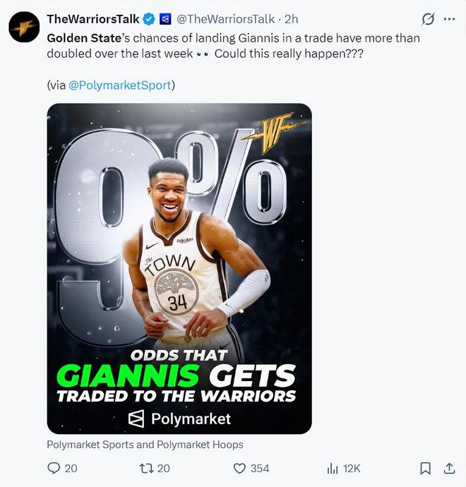 根據(jù)數(shù)據(jù)媒體PKS的報道,短短一周勇士隊(duì)交易得到揚(yáng)尼斯-阿德托昆博的概率提升了兩倍,勇士交易得到揚(yáng)尼斯的概率已經(jīng)提升到9%。